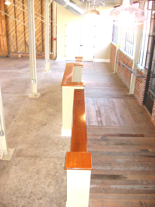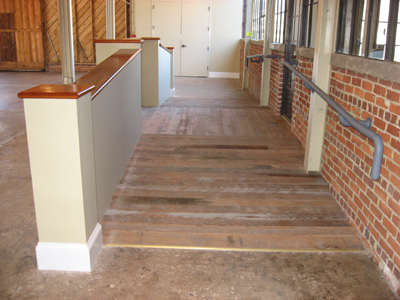 The Ramp is made of Heart of pine and the top rail is Red Oak with a custom stain